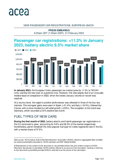 Parmi les principaux marchés de l'UE, l'Espagne a fortement rebondi (+51,4%) en janvier. L'Italie est en croissance de 19% sur un an, suivi de la France (+8,8%).