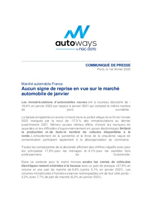 Les immatriculations d’automobiles neuves ont à nouveau décroché de -18,6% en janvier 2022 par rapport à janvier 2021 qui comptait le même nombre de jours ouvrables.