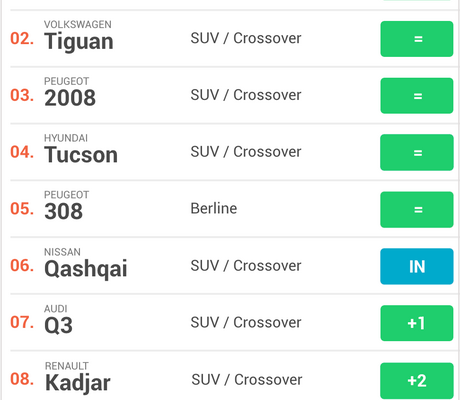 Puis, en queue de classement, on trouve le Renault Kadjar et la Volkswagen Golf. En 9ème position, la Peugeot 208 eclipse sa concurrente Renault Clio du classement. Mais cette dernière y est déjà de retour en ce début de mois septembre : le combat est plus acharné que jamais depuis que sa version restylée a été présentée (juillet).