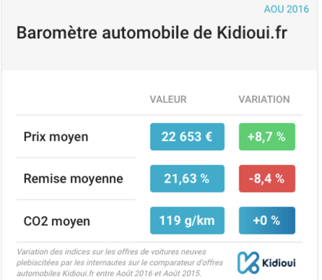 Le baromètre Kidioui.fr a été établi à partir des données récoltées lors des centaines de milliers de requêtes trimestrielles des internautes en recherche de véhicule neuf et des données fournies dans les 30 000 offres de nos vendeurs partenaires, mises à jour quotidiennement.
