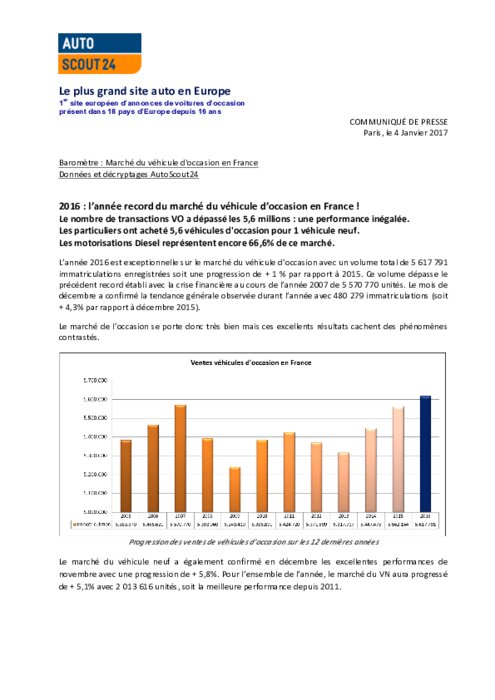 Selon cette étude effectuée par la société AAA pour AutoScout24, 66,6% des automobiles particulières d'occasion vendues dans l'Hexagone en 2016 roulaient au gazole, soit 3,7 millions d'unités sur un total de 5,6 millions. La proportion décroît légèrement depuis 2013 après avoir culminé à 68% des ventes.