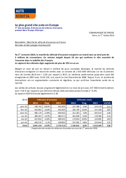 Au 1er semestre 2016, le marché du véhicule d'occasion enregistre un record avec au total près de 3 millions de transactions. Un volume inégalé depuis 10 ans qui confirme le rôle essentiel de l'occasion dans la mobilité des français. Le segment des véhicules âgés augmente de plus de 13% en un an.