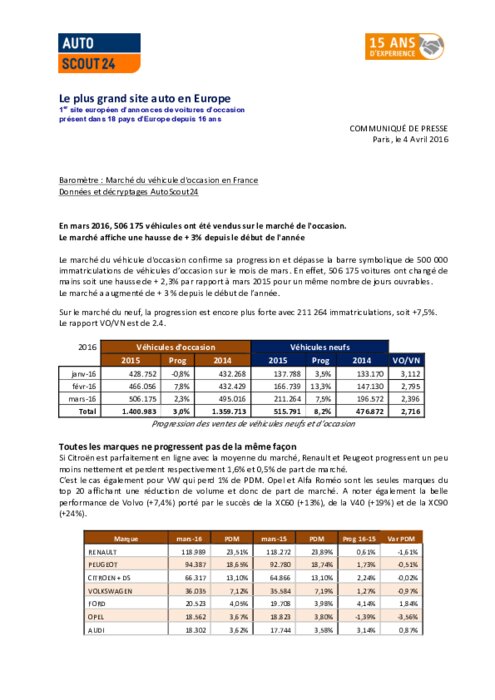 VO 04 avril 2016 - 11:19 En mars 2016, 506 175 véhicules ont été vendus sur le marché de l'occasion. Le marché affiche une hausse de + 3% depuis le début de l'année. PDF (113 Ko) Télécharger