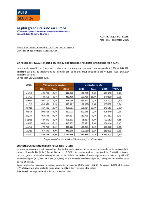 VO 01 décembre 2016 - 16:55 Le marché du véhicule d'occasion conforte sa bonne dynamique avec une hausse de + 4,7% et 469.498 immatriculations. Parallèlement, le marché des véhicules neuf progresse de + 8,5% avec 163.170 immatriculations. Le rapport VO/VN est de 2.88. PDF (119 Ko) Télécharger