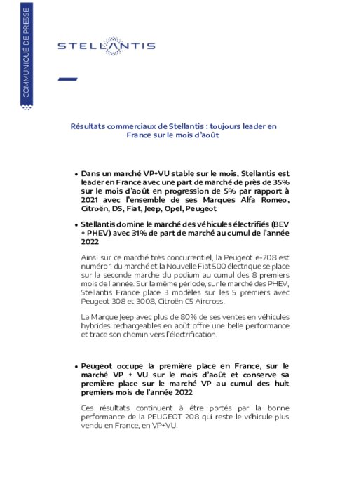 Dans un marché VP+VU stable sur le mois, Stellantis est leader en France avec une part de marché de près de 35% sur le mois d’août en progression de 5% par rapport à 2021 avec l’ensemble de ses Marques Alfa Romeo, Citroën, DS, Fiat, Jeep, Opel, Peugeot.