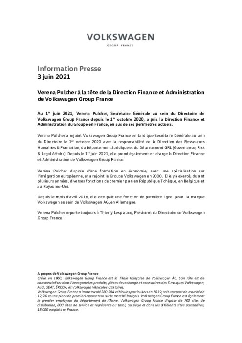 Constructeurs 03 juin 2021 - 10:51 Au 1er juin 2021, Verena Pulcher, Secrétaire Générale au sein du Directoire de Volkswagen Group France depuis le 1er octobre 2020, a pris la Direction Finance et Administration du Groupe en France, en sus de ses périmètres actuels. PDF (119 Ko) Télécharger