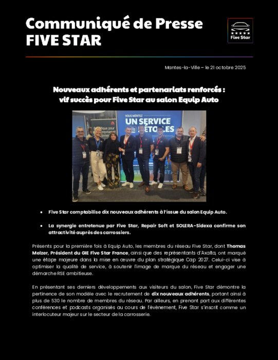 Présents pour la première fois à Equip Auto, les membres du réseau Five Star, dont Thomas Melzer, Président du GIE Five Star France, ainsi que des représentants d’Axalta, ont marqué une étape majeure dans la mise en œuvre du plan stratégique Cap 2027. Celui-ci vise à optimiser la qualité de service, à soutenir l'image de marque du réseau et engager une démarche RSE ambitieuse.