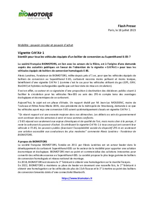 La société Française BIOMOTORS, en lien avec les acteurs de la filière, est à l’origine d’une demande auprès des autorités publiques en faveur de l’obtention de la vignette « Crit’Air1 » pour tous les véhicules équipés de boîtiers de conversion homologués E-85. Alexis Landrieu, Fondateur de BIOMOTORS, milite depuis près d’1 an, pour que les véhicules équipés de boîtiers de conversion au Superéthanol E-85, carburant reconnu moins polluant et moins toxique, bénéficient d’une vignette Crit’Air 1.