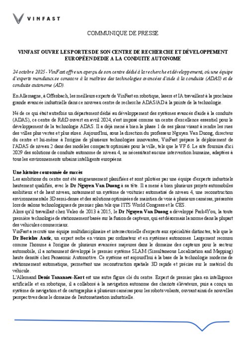 du centre et lui-même à l'origine de plusieurs technologies innovantes, VinFast prépare le déploiement de