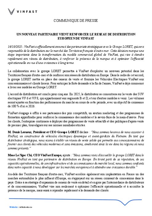 VinFast a officiellement annoncé des partenariats stratégiques avec le Groupe LORET, qui sera responsable de la distribution sur le marché des Territoires français d'outre-mer. Cette décision marque une étape importante dans la transformation du modèle commercial global de VinFast, qui vise à étendre rapidement son réseau de distribution, à renforcer la présence de la marque et à optimiser l'efficacité opérationnelle en vue d'une croissance à long terme.