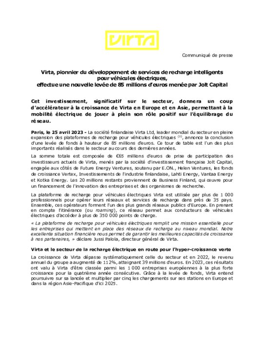 Services 25 avril 2023 - 10:08 Cet investissement, significatif sur le secteur, donnera un coup d’accélérateur à la croissance de Virta en Europe et en Asie, permettant à la mobilité électrique de jouer à plein son rôle positif sur l’équilibrage du réseau. PDF (89 Ko) Télécharger