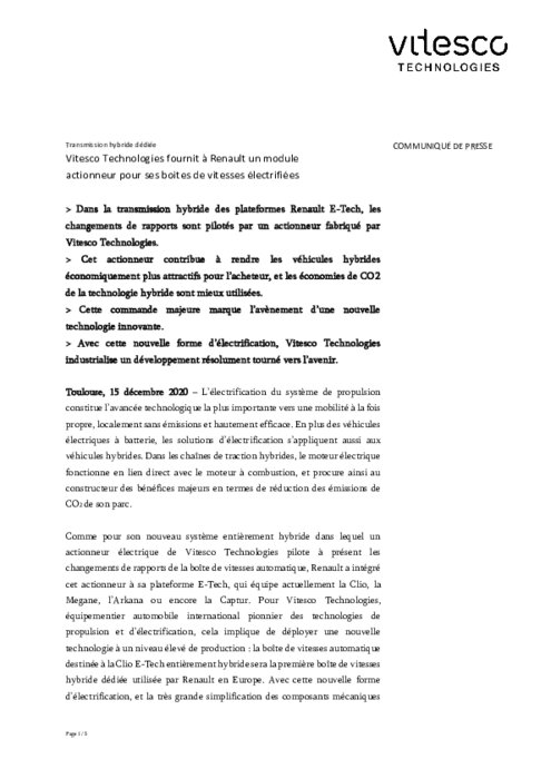 Vitesco Technologies fournit à Renault un module actionneur pour ses boites de vitesses électrifiées