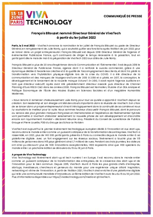 VivaTech annonce la nomination le 1er juillet de François Bitouzet au poste de Directeur Général, en remplacement de Julie Ranty, qui a souhaité quitter ses fonctions après l’édition de juin 2022 pour se lancer dans un projet entrepreneurial. François Bitouzet est depuis 2018 Directeur Général de l’agence d’événementiel PublicisLive France, qu’il continuera de diriger le temps nécessaire à la passation, tout en participant dès le mois de mai à la préparation de VivaTech 2022.