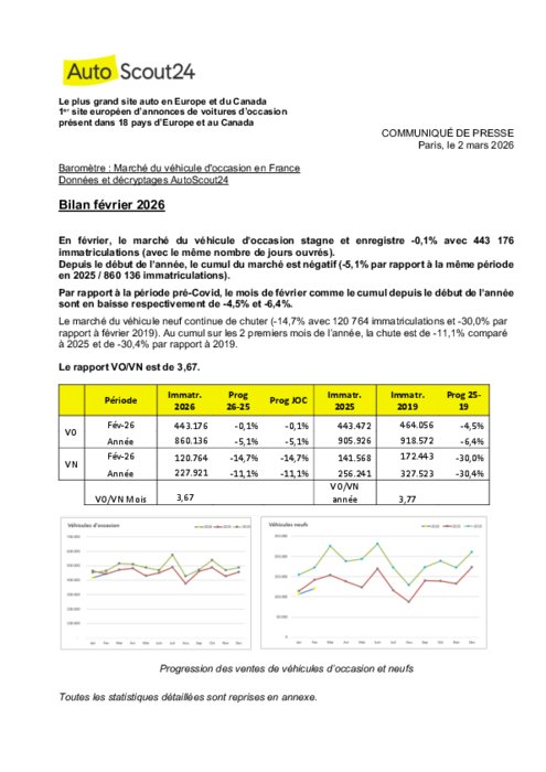 En février, le marché du véhicule d’occasion stagne et enregistre -0,1% avec 443 176 immatriculations (avec le même nombre de jours ouvrés). Depuis le début de l’année, le cumul du marché est négatif (-5,1% par rapport à la même période en 2025 / 860 136 immatriculations). Par rapport à la période pré-Covid, le mois de février comme le cumul depuis le début de l’année sont en baisse respectivement de-4,5% et -6,4%.