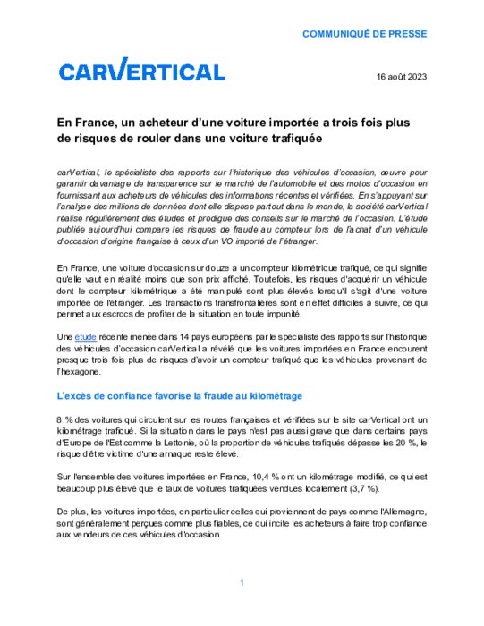 En s’appuyant sur l’analyse des millions de données dont elle dispose partout dans le monde, la société carVertical réalise régulièrement des études et prodigue des conseils sur le marché de l’occasion. L’étude publiée aujourd’hui compare les risques de fraude au compteur lors de l’achat d’un véhicule d’occasion d’origine française à ceux d’un VO importé de l’étranger.