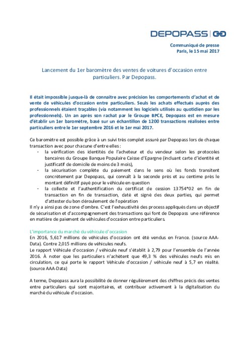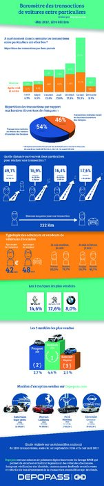 Il était impossible jusque-là de connaître avec précision les comportements d'achat et de vente de VO entre particuliers. Seuls les achats effectués auprès des professionnels étaient traçables (via notamment les logiciels utilisés au quotidien par les professionnels). Un an après son rachat par le Groupe BPCE, Depopass est en mesure d'établir un 1er baromètre, basé sur un échantillon de 1200 transactions réalisées entre particuliers entre le 1er septembre 2016 et le 1er mai 2017.