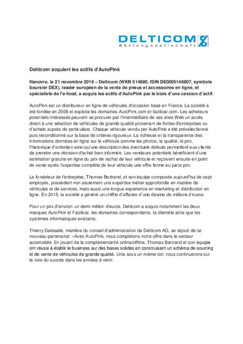 Delticom, leader européen de la vente de pneus et accessoires en ligne, et spécialiste de l’e-food, a acquis les actifs d'AutoPink par le biais d'une cession d’actif. AutoPink est un distributeur en ligne de véhicules d'occasion basé en France. Les acheteurs potentiels intéressés peuvent se procurer par l'intermédiaire de ses sites Web un accès direct à une sélection de véhicules de grande qualité provenant de flottes d'entreprises ou d’achats auprès de particuliers.