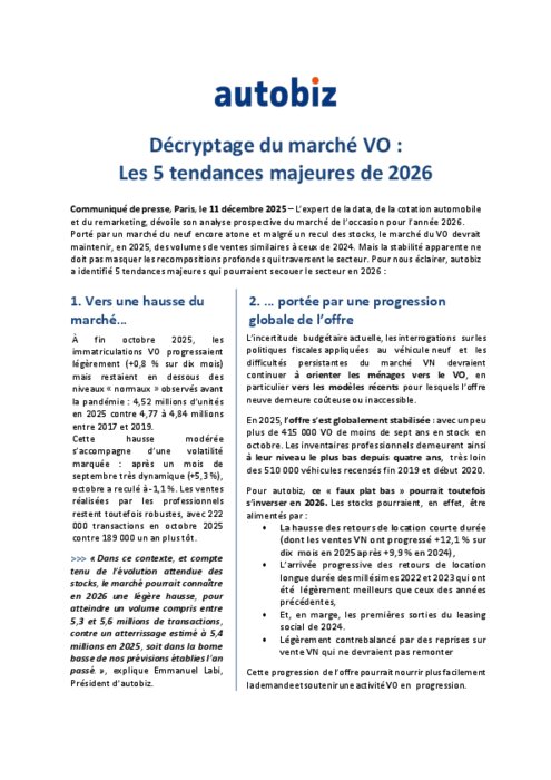 Autobiz, l’expert en data, en cotation automobile et en remarketing présente sa projection du marché de l’occasion pour 2026. Dans un contexte où le marché du neuf demeure morose et malgré une baisse des stocks, le marché du véhicule d’occasion devrait conserver en 2025 des volumes de ventes proches de ceux de 2024. Toutefois, cette stabilité apparente ne doit pas occulter les profondes recompositions à l’œuvre dans le secteur. Pour mieux comprendre ces évolutions, Autobiz a identifié cinq tendances majeures susceptibles de bousculer le marché en 2026.