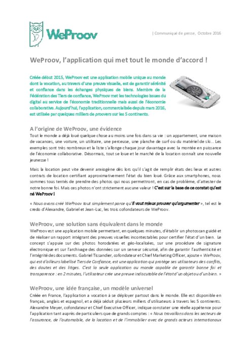 Aujourd’hui les gens prennent en effet des photos mais celles-ci n’ont aucune valeur juridique. Grâce à WeProov, vendeurs, loueurs, revendeurs, particuliers, …, tous les profils d’utilisateurs de l’appli sont protégés. La start up s’adresse aussi bien aux particuliers (ex : location de voitures entre particuliers),qu’aux grands comptes (assurances, loueurs) Exemple : dans le cadre de la location de voiture, les deux parties seront présentes pour établir l’état des lieux via l’application.