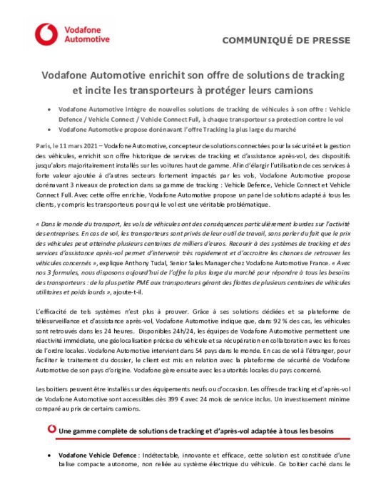 Vodafone Automotive, concepteur de solutions connectées pour la sécurité et la gestion des véhicules, enrichit son offre historique de services de tracking et d'assistance après-vol, des dispositifs jusqu'alors majoritairement installés sur les voitures haut de gamme. Afin d'élargir l'utilisation de ces services à forte valeur ajoutée à d'autres secteurs fortement impactés par les vols, Vodafone Automotive propose dorénavant 3 niveaux de protection dans sa gamme de tracking...