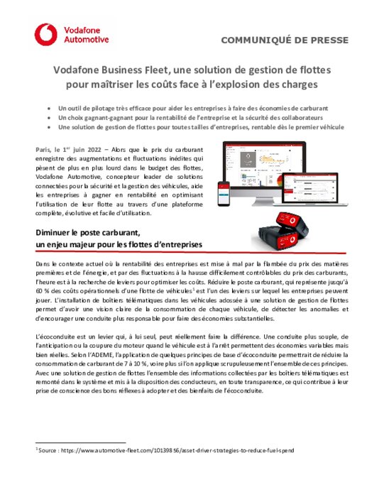 Alors que le prix du carburant enregistre des augmentations et fluctuations inédites qui pèsent de plus en plus lourd dans le budget des flottes, Vodafone Automotive, concepteur leader de solutions connectées pour la sécurité et la gestion des véhicules, aide les entreprises à gagner en rentabilité en optimisant l’utilisation de leur flotte au travers d’une plateforme complète, évolutive et facile d’utilisation.