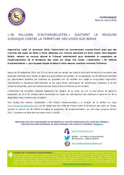 Lundi 14 novembre 2016, l’association de commerçants Louvres-Rivoli ainsi que des riverains des quais de Seine à Paris, défendus par l’avocat spécialisé en droit routier Jean-Baptiste IOSCA, ont mené un recours devant le Tribunal administratif pour demander la suspension de l’expérimentation de la fermeture des voies sur berge rive droite. L’association "40 millions d’automobilistes", qui s’oppose depuis le début à cette mesure, soutient vivement l’initiative.