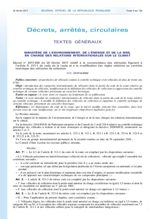 Ce texte exempte de contrôle technique les véhicules légers de collection mis en circulation avant 1960 et les poids lourds de collection. Il transpose en droit français une directive européenne de 2014.