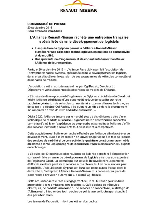 L'intégration de quelque 40 ingénieurs Sylpheo au sein de Renault-Nissan "apportera une expertise sur le développement des logiciels et l'informatique dématérialisée", a affirmé Ogi Redzic, vice-président de l'alliance chargé des véhicules connectés, cité dans un communiqué.