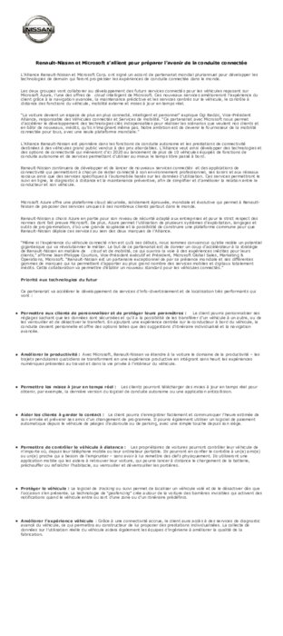 "Même si l'expérience du véhicule connecté n'en est qu'à ses débuts, nous sommes convaincus qu'elle recèle un potentiel gigantesque qui va révolutionner le métier. Le but de ce partenariat est de donner un coup d'accélérateur à la stratégie de Renault-Nissan" dans ce domaine, a indiqué Jean-Philippe Courtois, vice-président exécutif de Microsoft, cité dans le communiqué.