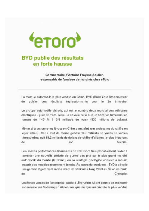 BYD a réalisé sur la période janvier-juin un bénéfice net de 10,95 milliards de yuans (1,39 milliard d'euros), en hausse de 204,6% sur un an, a indiqué le groupe dans un communiqué à la Bourse de Hong Kong où le groupe est coté.