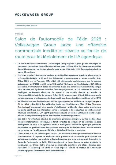 Volkswagen Group entre de plain-pied dans l’ère de la mobilité intelligente à l’occasion de l’événement presse Group Media Night, organisé en amont du Salon de l’automobile de Pékin 2026 (Auto China 2026). Dans le cadre de la mise en œuvre de sa stratégie « en Chine, pour la Chine », l’entreprise dévoile notamment un portefeuille de modèles renouvelé avec quatre premières mondiales. Design, services numériques d’affichage et de commande à bord, systèmes d’aide à la conduite avancés (ADAS) : tout a été conçu spécifiquement pour la clientèle chinoise. Le Groupe présente également sa feuille de route baptisée « Agentic AI for all » en vue du déploiement de l’IA agentique sur ses futurs modèles. Axée autour de la nouvelle architecture électronique évolutive « China Electronic Architecture » (CEA), l’IA agentique permettra d’intégrer différentes fonctionnalités intelligentes de conduite, d’affichage et de commande à bord au sein d’un système unifié, sur des modèles tous types de motorisation confondus.