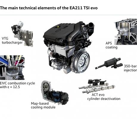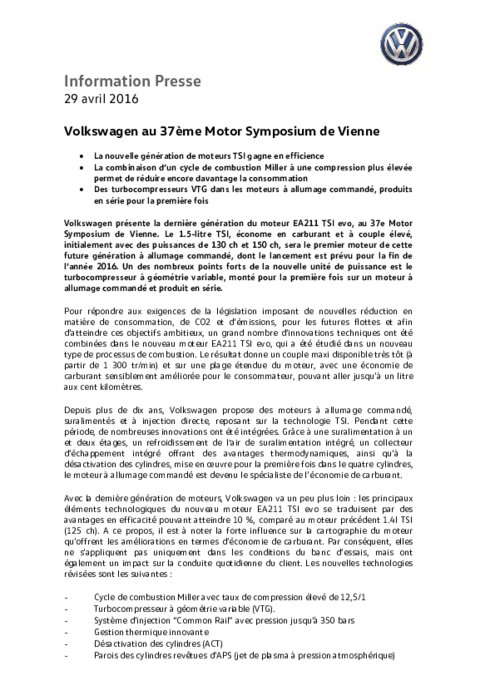 Volkswagen présente la dernière génération du moteur EA211 TSI evo, au 37e Motor Symposium de Vienne. Le 1.5-litre TSI, économe en carburant et à couple élevé, initialement avec des puissances de 130 ch et 150 ch, sera le premier moteur de cette future génération à allumage commandé, dont le lancement est prévu pour la fin de l’année 2016.
