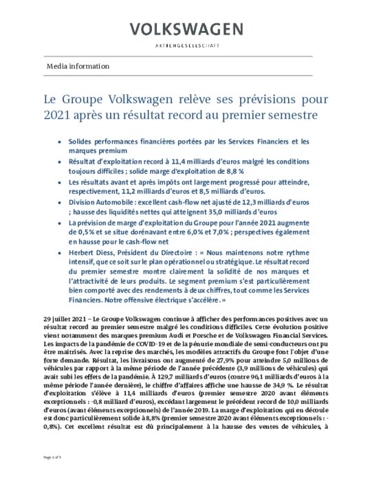 Les livraisons ont augmenté de 27,9% pour atteindre 5,0 millions de véhicules par rapport à la même période de l’année précédente (3,9 millions de véhicules) qui avait subi les effets de la pandémie. À 129,7 milliards d’euros (contre 96,1 milliards d’euros à la même période l’année dernière), le chiffre d’affaires affiche une hausse de 34,9 %. Le résultat d’exploitation s’élève à 11,4 milliards d’euros (premier semestre 2020 avant éléments exceptionnels : -0,8 milliard d’euros).