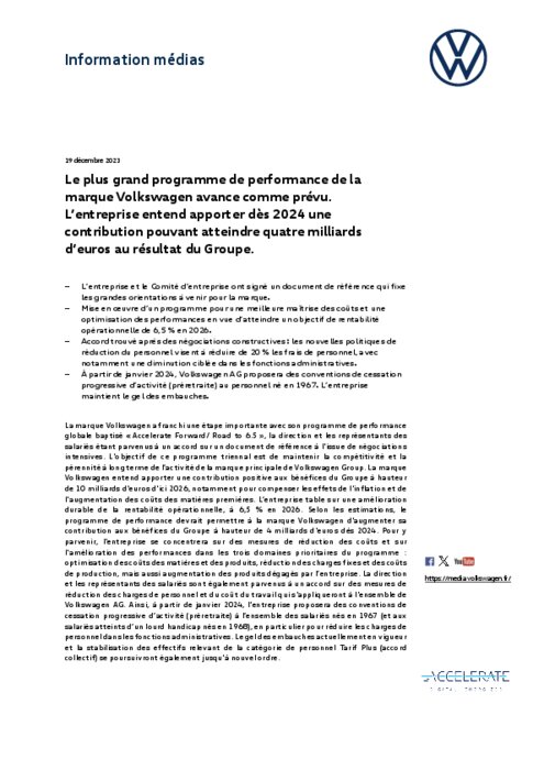 La marque Volkswagen a franchi une étape importante avec son programme de performance globale baptisé « Accelerate Forward/ Road to 6.5 », la direction et les représentants des salariés étant parvenus à un accord sur un document de référence à l'issue de négociations intensives. L'objectif de ce programme triennal est de maintenir la compétitivité et la pérennité à long terme de l’activité de la marque principale de Volkswagen Group.