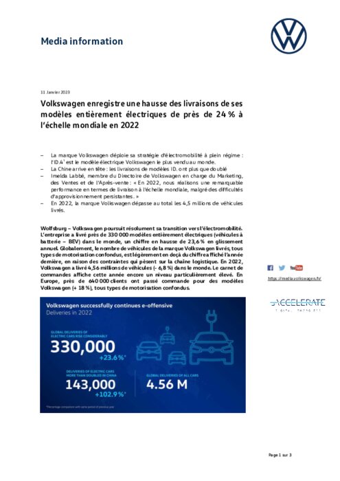 Volkswagen poursuit résolument sa transition vers l’électromobilité. L’entreprise a livré près de 330 000 modèles entièrement électriques (véhicules à batterie – BEV) dans le monde, un chiffre en hausse de 23,6 % en glissement annuel. Globalement, le nombre de véhicules de la marque Volkswagen livrés, tous types de motorisation confondus, est légèrement en deçà du chiffre affiché l’année dernière, en raison des contraintes qui pèsent sur la chaîne logistique.