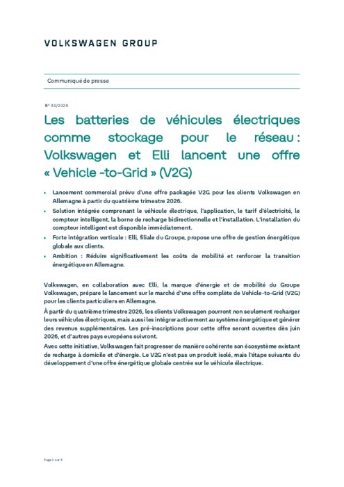 Constructeurs 17 avril 2026 - 15:50 Volkswagen, en collaboration avec Elli, la marque d'énergie et de mobilité du Groupe Volkswagen, prépare le lancement sur le marché d'une offre complète de Vehicle-to-Grid (V2G) pour les clients particuliers en Allemagne. PDF (230 Ko) Télécharger