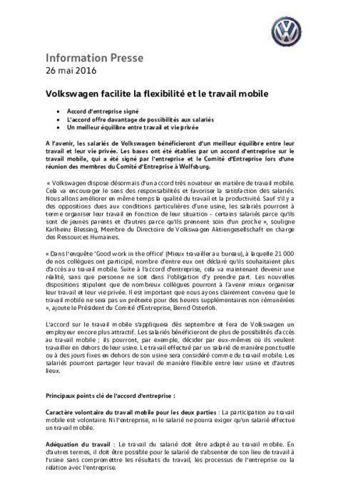 A l’avenir, les salariés de Volkswagen bénéficieront d’un meilleur équilibre entre leur travail et leur vie privée. Les bases ont été établies par un accord d'entreprise sur le travail mobile, qui a été signé par l'entreprise et le Comité d'Entreprise lors d'une réunion des membres du Comité d'Entreprise à Wolfsburg.