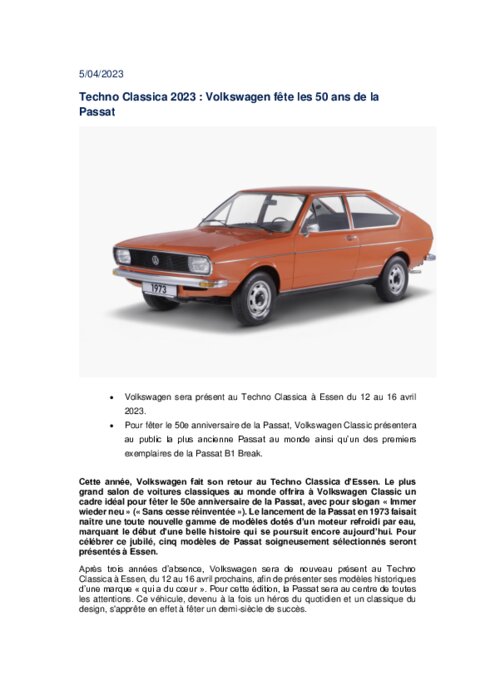 Le plus grand salon de voitures classiques au monde offrira à Volkswagen Classic un cadre idéal pour fêter le 50e anniversaire de la Passat, avec pour slogan « Immer wieder neu » (« Sans cesse réinventée »). Le lancement de la Passat en 1973 faisait naître une toute nouvelle gamme de modèles dotés d’un moteur refroidi par eau.