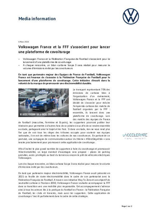 En tant que partenaire majeur des Equipes de France de Football, Volkswagen France est heureux de s'associer à la Fédération Française de Football pour le lancement d’une plateforme de covoiturage. Cette initiative s'inscrit dans la volonté de la marque de promouvoir une électromobilité durable.