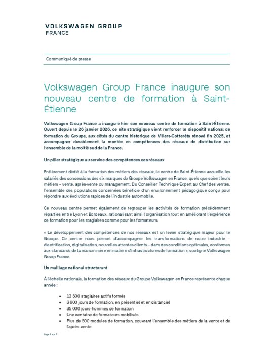 Volkswagen Group France a inauguré hier son nouveau centre de formation à Saint‑Étienne. Ouvert depuis le 26 janvier 2026, ce site stratégique vient renforcer le dispositif national de formation du Groupe, aux côtés du centre historique de Villers‑Cotterêts rénové fin 2025, et accompagner durablement la montée en compétences des réseaux de distribution sur l'ensemble de la moitié sud de la France.