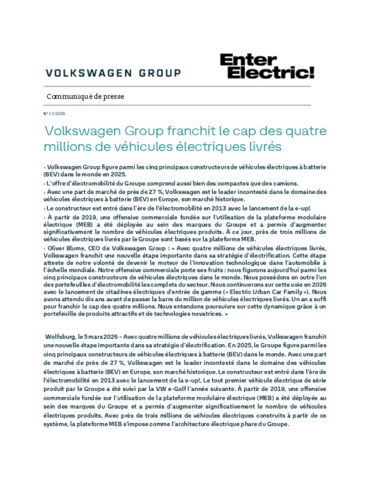 Avec quatre millions de véhicules électriques livrés, Volkswagen franchit une nouvelle étape importante dans sa stratégie d'électrification. En 2025, le Groupe figure parmi les cinq principaux constructeurs de véhicules électriques à batterie (BEV) dans le monde. Avec une part de marché de près de 27 %, Volkswagen est le leader incontesté dans le domaine des véhicules électriques à batterie (BEV) en Europe, son marché historique. Le constructeur est entré dans l'ère de l'électromobilité en 2013 avec le lancement de la e-up!, Le tout premier véhicule électrique de série produit par le Groupe a été suivi par la VW e-Golf l'année suivante.
