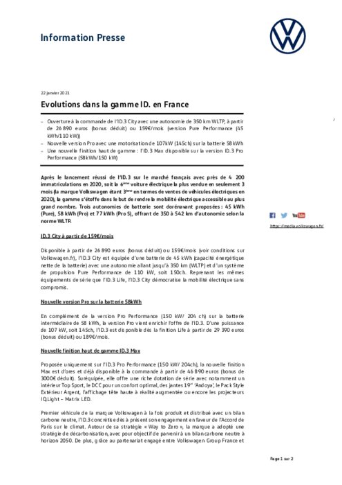 Après le lancement réussi de l’ID.3 sur le marché français avec près de 4 200 immatriculations en 2020, soit la 6è voiture électrique la plus vendue en seulement 3 mois (Volkswagen étant 3ème en termes de ventes de véhicules électriques en 2020), la gamme s’étoffe dans le but de rendre la mobilité électrique accessible au plus grand nombre. Trois autonomies de batterie sont proposées : 45 kWh (Pure), 58 kWh (Pro) et 77 kWh (Pro S), offrant de 350 à 542 km d’autonomie selon la norme WLTP.