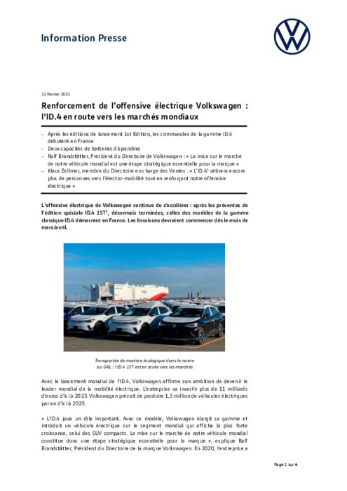 L'offensive électrique de Volkswagen continue de s'accélérer : après les préventes de l'édition spéciale ID.4 1ST2, désormais terminées, celles des modèles de la gamme classique ID.4 démarrent en France. Les livraisons devraient commencer dès le mois de mars/avril.