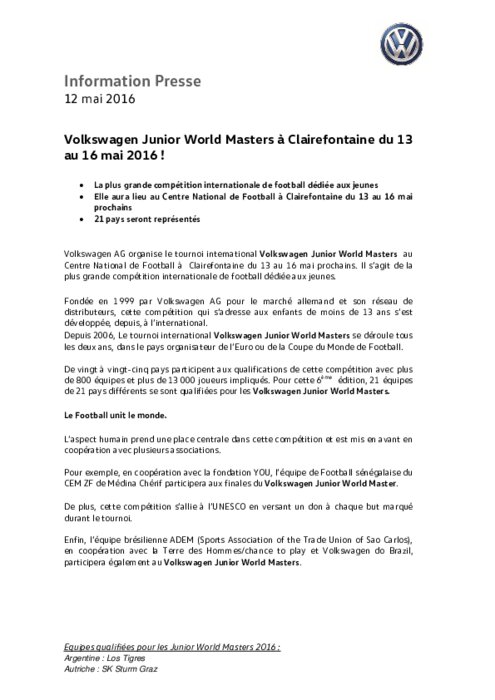 Volkswagen organise le tournoi international Volkswagen Junior World Masters au Centre National de Football à Clairefontaine du 13 au 16 mai prochains. Il s’agit de la plus grande compétition internationale de football dédiée aux jeunes. Fondée en 1999 par Volkswagen pour le marché allemand et son réseau de distributeurs, cette compétition qui s’adresse aux enfants de moins de 13 ans s’est développée, depuis, à l’international.