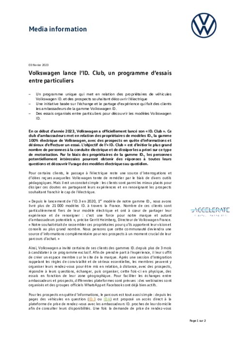 En ce début d’année 2023, Volkswagen a officiellement lancé son « ID. Club ». Ce club d’ambassadeurs met en relation des propriétaires de modèles ID., la gamme 100% électrique de Volkswagen, avec des prospects en quête d'informations et désireux d’effectuer un essai. L'objectif de l’« ID. Club » est d'initier le plus grand nombre de personnes à la conduite électrique et de dissiper les a priori sur ce type de motorisation.