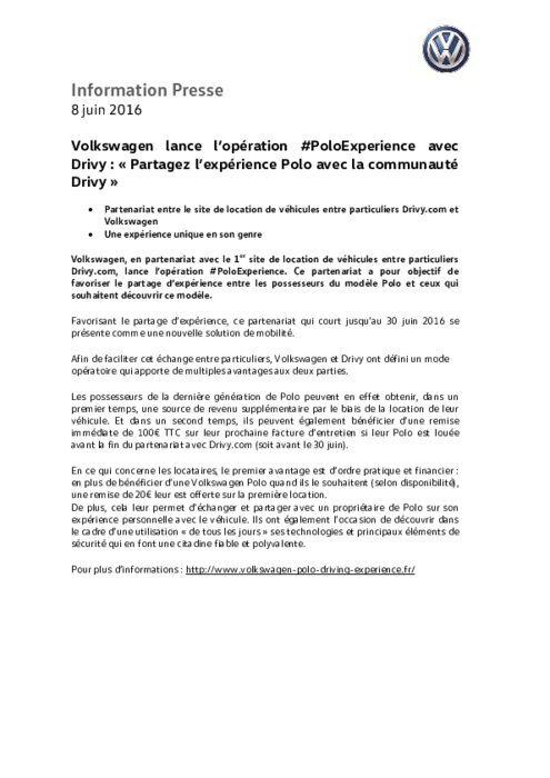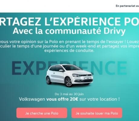 Volkswagen, en partenariat avec le 1er site de location de véhicules entre particuliers Drivy.com, lance l’opération #PoloExperience. Ce partenariat a pour objectif de favoriser le partage d’expérience entre les possesseurs du modèle Polo et ceux qui souhaitent découvrir ce modèle.