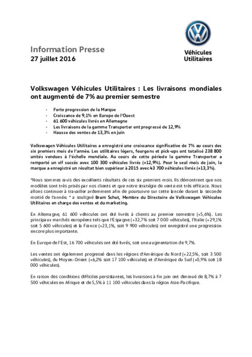 Volkswagen Véhicules Utilitaires a enregistré une croissance significative de 7% au cours des six premiers mois de l’année. Les utilitaires légers, fourgons et pick-ups ont totalisé 238 800 unités vendues à l’échelle mondiale. Au cours de cette période la gamme Transporter a remporté un vif succès avec 100 300 véhicules livrés (+12,9%). Pour le seul mois de juin, la marque a enregistré un résultat bien supérieur à 2015 avec 43 700 véhicules livrés (+13,3%).