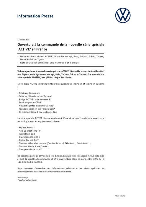 Constructeurs 12 février 2021 - 12:01 Volkswagen lance la nouvelle série spéciale ‘ACTIVE’ disponible sur ses best-sellers Golf 8 et Tiguan, mais également sur up!, Polo, T-Cross, T-Roc et Touran. Elle succède à la série spéciale ‘UNITED’, très plébiscitée par les clients. PDF (158 Ko) Télécharger