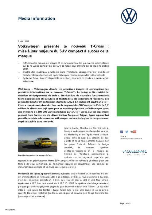Volkswagen dévoile les premières images et communique les premières informations sur le nouveau T-Cross. Le design a été revisité, la dotation en équipements de série a été étendue, de nouvelles fonctionnalités technologiques ont été ajoutées et l’habitacle a été entièrement redessiné. Les préventes débuteront au troisième trimestre 2023.