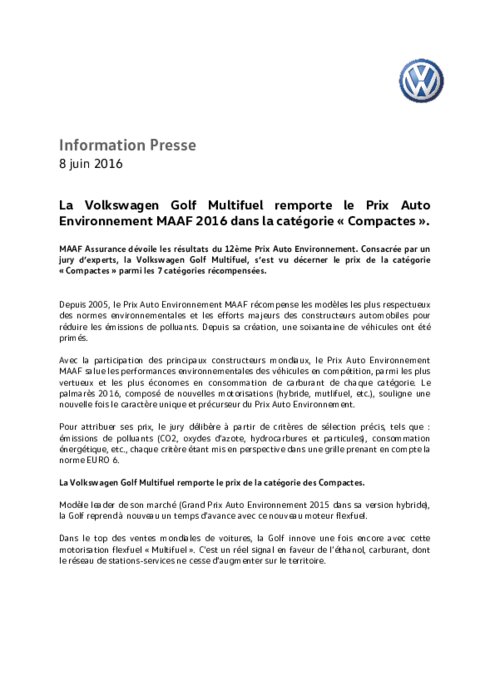 Constructeurs 08 juin 2016 - 19:15 MAAF Assurance dévoile les résultats du 12ème Prix Auto Environnement. Consacrée par un jury d’experts, la Volkswagen Golf Multifuel, s’est vu décerner le prix de la catégorie " Compactes " parmi les 7 catégories récompensées. PDF (129 Ko) Télécharger